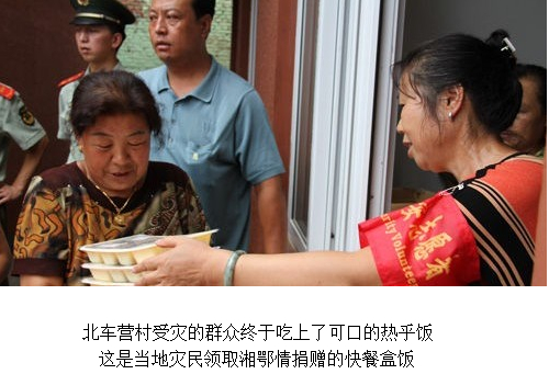 北車營村村長翟瑞生說,“村民已吃了近一周的方便面,湘鄂情送來的飯菜讓大家特別高興,終于可以換換口味,品嘗到新鮮可口的熱飯熱菜了!