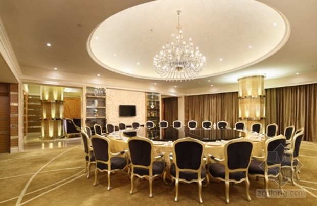 設計師摒棄了傳統高檔餐廳的金碧輝煌,在大廳的設計中將“牡丹”、“祥云”、“浮萍”、“瓦片”等元素運用其中,寄托了對東方文化的無限情感!澳档ぁ敝饕憩F在頂面造型之中,在恢弘的空間中增添了優雅的氣質,烘托清雅閑逸的情境。“祥云”躍然于畫面之上,散發著無限曼妙的意境,富有煙云溟?的意趣,配合地面水波蕩漾的圖案,蜿蜓又悠然自得的神態表現的淋淋盡致,豐富了視覺效果,讓人不禁幻想是徜徉在一望無際的大海之中。中庭的設計將柱子與梁的結構大膽的運用和處理,使空間多了份莊嚴與質樸。傳統房屋中“瓦片”元素的運用更加貼近自然。