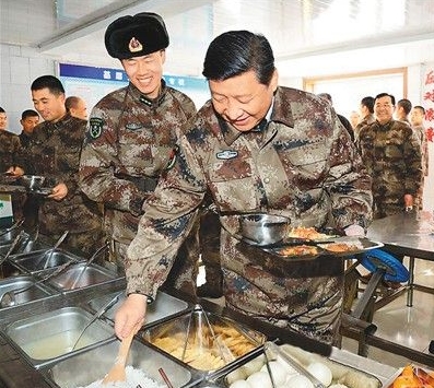 2014年1月26日,習(xí)近平在內(nèi)蒙古軍區(qū)邊防某團一連食堂排隊就餐。