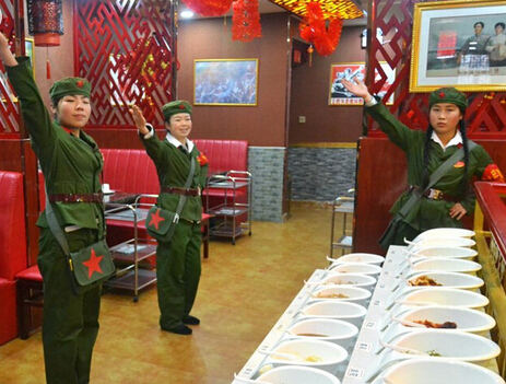2015年1月10日,在甘肅省平?jīng)鍪幸患倚麻_張的火鍋店,服務(wù)員們?nèi)堪绯伞凹t衛(wèi)兵”的樣子,每當(dāng)有客人走進(jìn)大廳,店門口的迎賓就喊:“老鄉(xiāng)您好!歡迎下鄉(xiāng)改善伙食。”在這家以“紅色餐飲”為主題文化的火鍋店,記者還發(fā)現(xiàn),這家火鍋店吸人眼球的不僅僅是服務(wù)員“紅衛(wèi)兵”的打扮,還有許多新鮮的叫法更是讓人好奇,甚至有時(shí)候讓前來消費(fèi)的顧客忍俊不禁。店內(nèi)服務(wù)員管同事叫“社員”,稱包廂為“公社”,稱主管為“隊(duì)長(zhǎng)”,他們還把菜譜叫“革命語錄”,把啤酒叫做“地雷”,白酒稱作“炸彈”,餐廳紙是“雞毛信”,代金券是“糧票”。