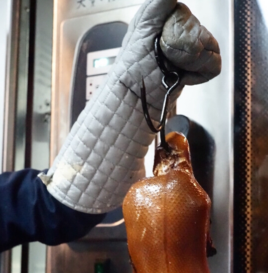 烤鴨一出爐,就會被立刻分割,如果沒有馬上做成漢堡送到運氣超好的客人的嘴里,就會把分好的鴨皮和鴨肉分開專門保溫。對烤鴨了解至極的大董專門為鴨皮和鴨肉分別設計了不同的保溫箱,溫度和濕度都不一樣,以保持剛出爐的風味。鴨子最多在里面呆四十分鐘,這是大董認為可以保持鴨皮噴香酥化、鴨肉多汁鮮嫩的完美狀態的時間范圍。在這個時間內沒有用完的鴨子,就不要了。