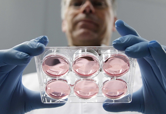 生產實驗室培養肉的干細胞大多取自牛的肌肉組織。提取出來的干細胞,在實驗室的營養物質和促生長的化學物催化下進一步發育繁殖。3個星期后,100多萬個干細胞就繁殖出來了,研究人員接著把它們放入實驗室的培養皿中,這些干細胞就會融合成為一條條約一厘米長、幾毫米厚的肌肉條。