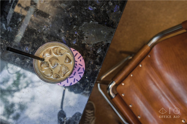 因為空間面積有限,很容易被“一眼看透”,因此在一些地方增加細碎感的設計反而可以為空間提供更多“信息量”,讓顧客的目光被不同的細節吸引,增加空間的層次和趣味,比如杯墊和糖罐上就是色彩和排版上比較活潑的設計,還有門把手、高腳凳、燈管懸吊處的天然皮革定制配件。