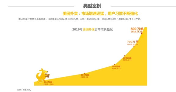 報(bào)告指出,外賣O2O市場(chǎng)增速迅猛,用戶習(xí)慣不斷強(qiáng)化。以美團(tuán)外賣為例,通過美團(tuán)外賣APP、美團(tuán)、大眾點(diǎn)評(píng)、手機(jī)QQ、微信等多元化的入口引流,截至今年9月,月活躍用戶數(shù)高達(dá)8,018萬(wàn)人。目前,美團(tuán)外賣的日訂單量更是超過了800萬(wàn)單,其中,日訂單量從500萬(wàn)單到600萬(wàn)單、600萬(wàn)單到700萬(wàn)單、700萬(wàn)單到800萬(wàn)單的增長(zhǎng)都只用了1個(gè)月左右。