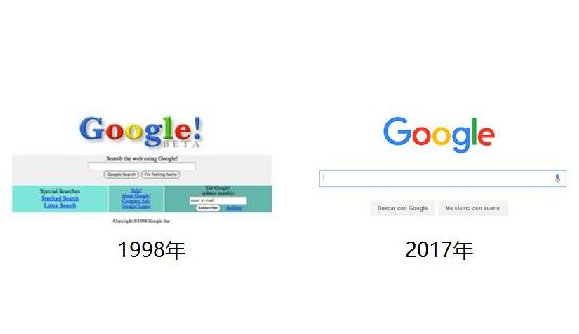 最重要的例子是 Google。Google 1998 年頁面長這樣,2017 年頁面長這樣,由消費者加入的入口越來越簡單,Google 越來越聰明。
