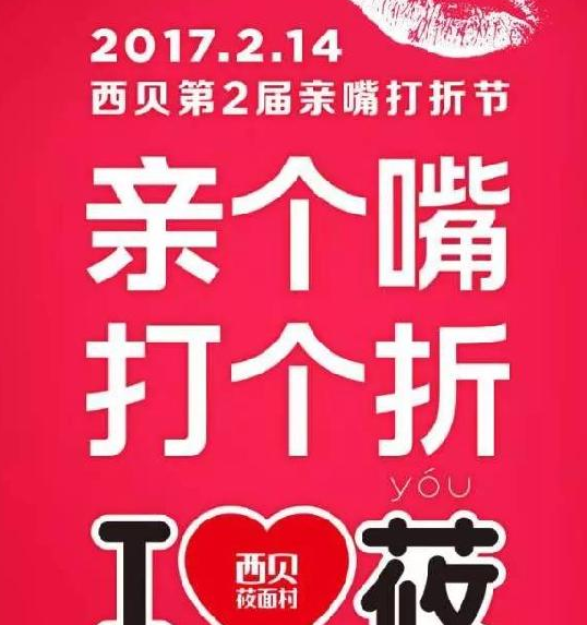 西貝2017年2月14日情人節(jié)的活動宣傳海報主題——親個嘴,打個折。