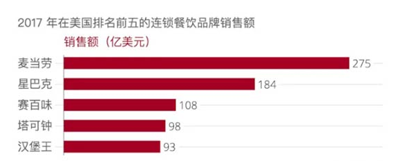排在塔可鐘前面的三個品牌分別是麥當勞、星巴克和賽百味,銷售額分別為275億美元、184億美元和108億美元。