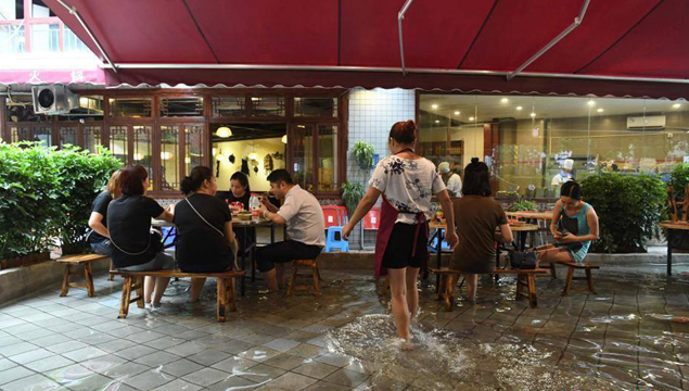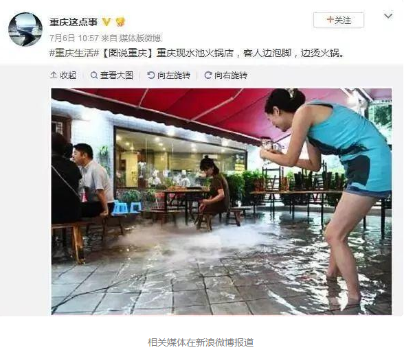 老板: 當(dāng)時是因?yàn)槲覀冊谶@沖地,每天晚上都要進(jìn)行沖地,因?yàn)樘珶崃艘獪p少地氣,所以我們搞了一個這種火鍋,覺得把腳打濕了挺涼快的。